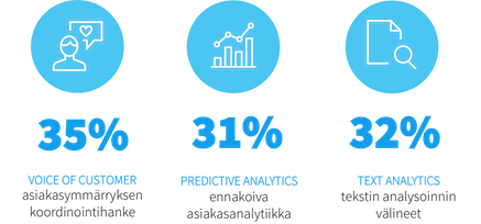 Työkaluja ja asiantuntijapalveluja ei osata vielä hyödyntää systemaattisesti. Noin kolmanneksessa vastaajayrityksistä on ollut käynnissä asiakasymmärryksen keräämiseen, mittaamiseen ja raportointiin (Voice of Customer) liittyvä hanke ja/tai hyödynnetty tähän liittyviä työkaluja jo pari vuotta. Työkaluja ennakoivan/ennustavan asiakasanalytiikan (Predictive Analytics) hyödyntämiseen asiakastietojen hallinnassa on käytössä vasta 31%:ssa yrityksistä, neljänneksessä niitä on käytetty yli 2 vuotta. Tekstin analysoinnin välineitä suurien tekstimassojen automaattiseen läpikäyntiin (esim. keskustelufoorumit, sosiaalisen median kanavat, asiakaspalautteet ja –kyselyt jne) on käyttänyt yhteensä 15% yrityksistä alle kaksi vuotta ja 8% yli kaksi vuotta. Yli puolessa vastaajayrityksistä niitä ei vielä ole käytössä laisinkaan. Tutkituista osa-alueista tähän alueeseen (Työkalut) panostusten tekeminen tarjoaakin selvästi mahdollisuuden lisätä yrityksen kilpailukykyä.