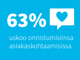 Vastaajien itsevarmuus onnistumisistaan asiakaskohtaamisissa on heikentynyt, ja tavoitteet on asetettu entistä korkeammalle. Kaikkiaan 63% vastaajista kokee oman yrityksensä asiakkuuskokemusten olevan keskiarvoa paremmat (2015: 83%/2014: 68%/2013: 84%). Selvästi kasvaneella enemmistöllä 95% (2015: 64%/2014: 70%/2013: 88%) yrityksistä on tavoitteena erottuminen muista kilpailijoista omalla toimialalla asiakkuuskokemuksia kehittämällä ja peräti 31%:lla (2015: 27%/2014: 27%/2013: 9%) yli toimialojen. Vastaajista selvästi suurin osa (2016: 89%/2015: 88%/2014: 81%/2013: 77%) kokee, että asiakkuuskokemusten johtamiseen liittyvillä aktiviteeteilla on ollut positiivinen vaikutus myös yrityksen tulokseen kuluneen vuoden aikana.
