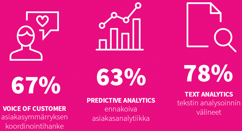 Työkaluja käyttävien organisaatioiden etumatka jatkuu. Noin seitsemässä kymmenestä vastaajayrityksestä (67%) on käynnissä asiakasymmärryksen keräämiseen, mittaamiseen ja raportointiin (Voice of Customer) liittyvä hanke ja/tai hyödynnetään tähän liittyviä työkaluja.